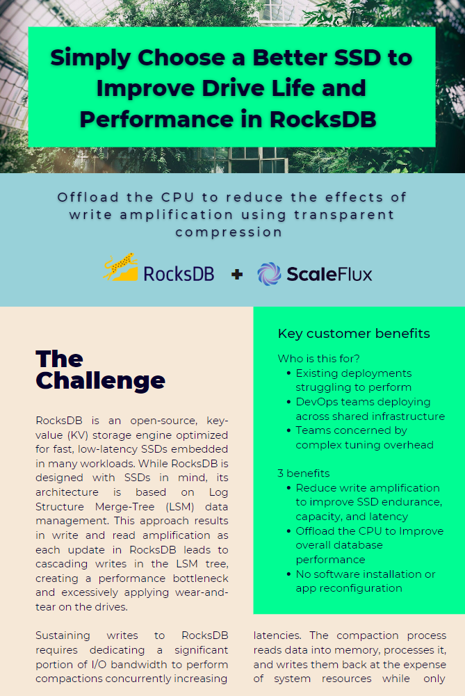 Try a Better SSD from ScaleFlux. Storage processors on each drive offload the CPU and with native NVMe support, you avoid the complexity of custom software. It’s that simple.